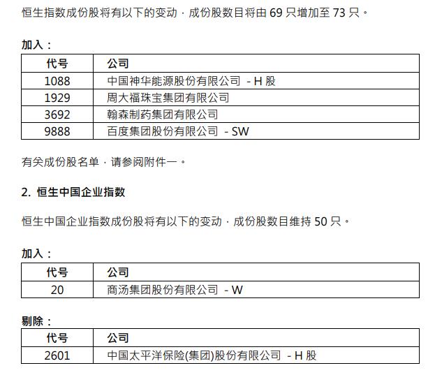 8月19日,据恒指公司消息,恒指公司将百度、中国神华、周大福、瀚森制药等4家公司纳入恒生指数,恒生指数成份股将由69只增加至73只。