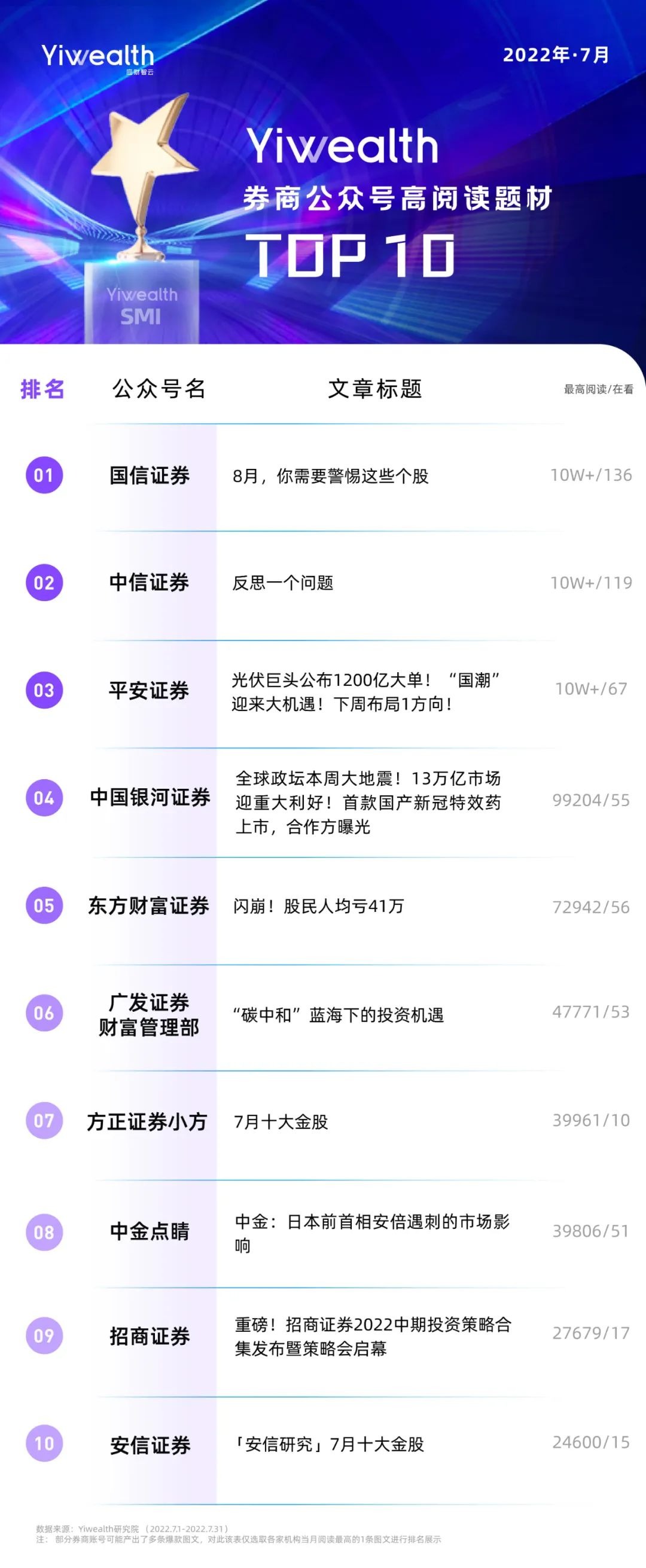 在7月公众号高赞题材Top10中,国信证券、中信证券、平安证券均取得了优异的成绩。