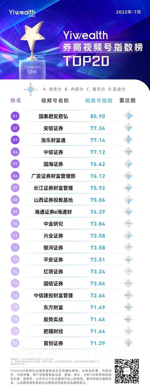 本期为券商社交媒体指数榜(2022年7月),分别从粉丝积累、内容创作、内容传播、用户互动等维度统计140家券商机构账号在抖音、视频号、公众号三大社交媒体平台上的表现,以反映其跨域运营趋势及品牌影响力。