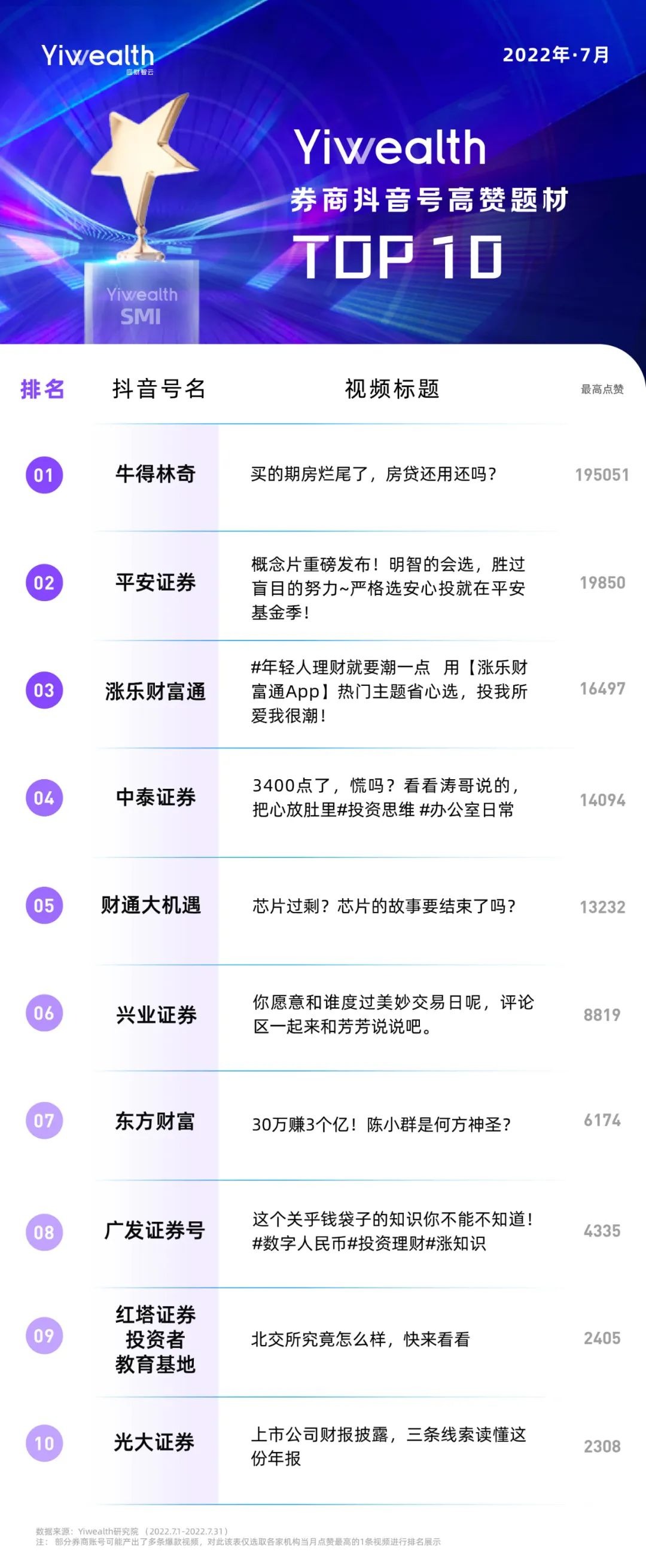 在7月抖音号高赞题材Top10中,牛得林奇的《买的期房烂尾了,房贷还用还吗?》、平安证券的《概念片重磅发布!明智的会选,胜过盲目的努力~严格选安心投就在平安基金季!》以及华泰证券的《年轻人理财就要潮一点用【涨乐财富通App】热门主题省心选,投我所爱我很潮!》分别以195051、19850、16497的点赞量位居榜单前三甲。