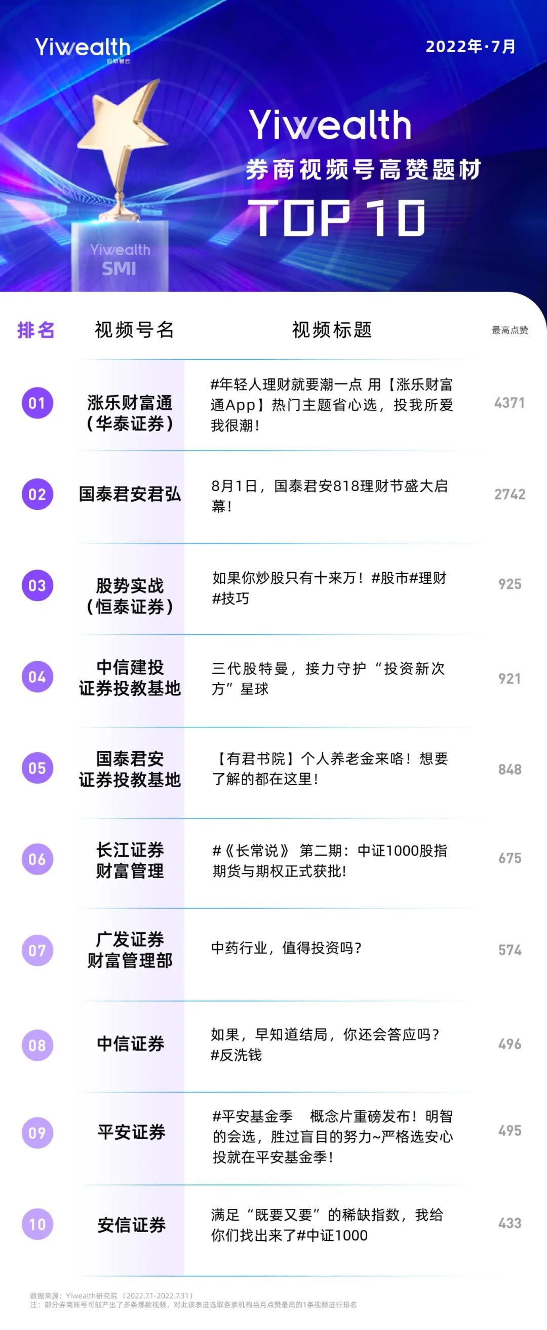 在7月视频号高赞题材Top10中,华泰证券、国泰君安证券、恒泰均取得了优异的成绩。