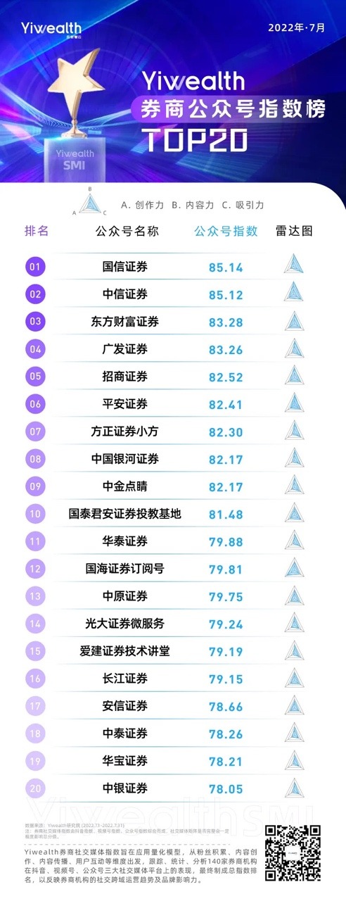 在7月券商公众号TOP20榜单中,国信证券、中信证券、东方财富证券位居榜单前三甲;新上榜的券商机构有:国信证券、安信证券、中泰证券、华宝证券。