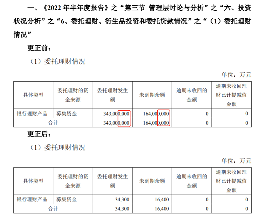 8月22日晚间,成都大宏立机器股份有限公司(下称大宏立,300865.SZ)发布了关于 2022 年半年度报告的更正公告。其中,公司报告期内委托理财发生额和未到期余额分别为3.43亿元、1.64亿元,误写成3.43万亿元、1.64万亿元。