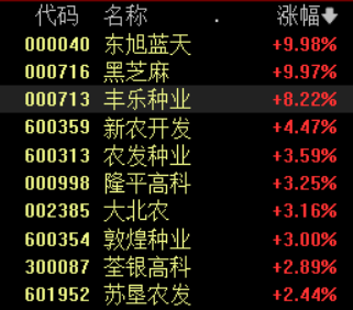 •粮食概念板块逆势走强,东旭蓝天、黑芝麻涨停,丰乐种业涨超8%,新农开发、农发种业、大北农等多股跟涨。