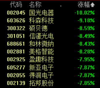 •消费电子板块回调,国光电器跌停,科森科技跌超9%,10余股跌超7%。
