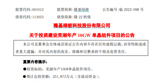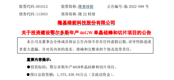 隆基绿能今日还发布公告,拟107.5亿元投资建设鄂尔多斯年产46GW单晶硅棒和硅片项目;拟25.2亿元投资建设芜湖年产10GW单晶组件项目。
