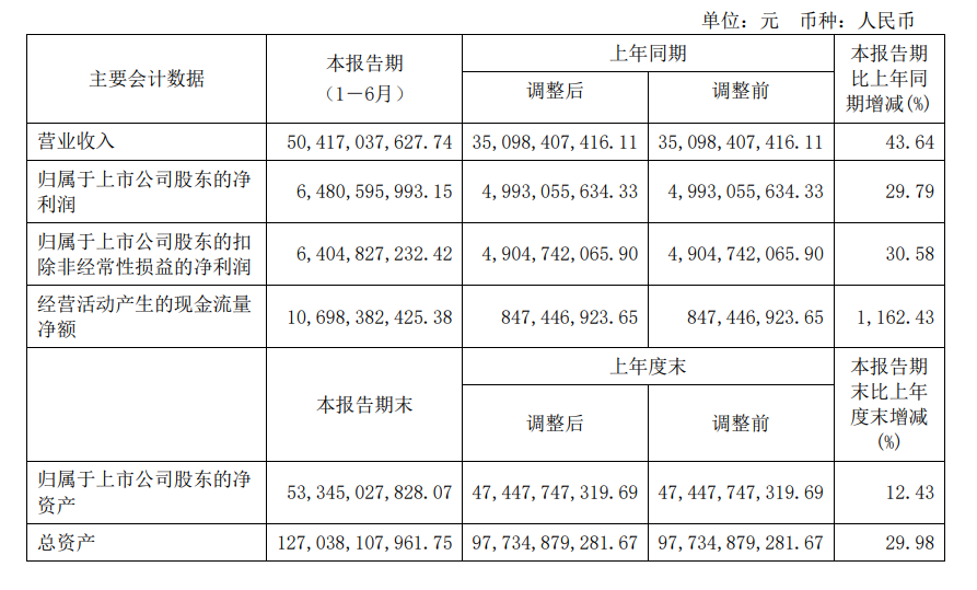 8月24日,隆基绿能披露2022年半年度报告,其中财务数据显示,上半年实现营业收入为504.17亿元,同比增长43.64%;归母净利润64.81亿元,同比增长29.79%;基本每股收益0.86元,同比增长30.30%。