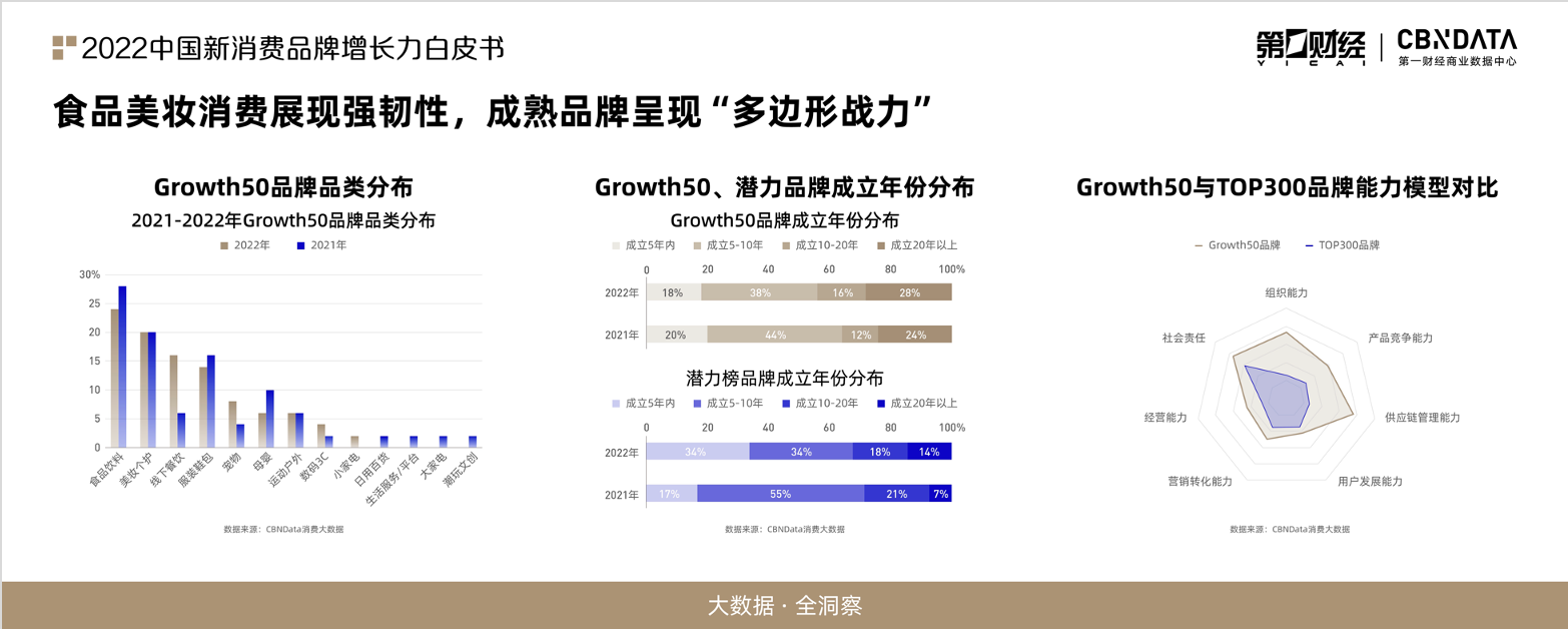 从最右边的雷达图还可以看到,对比我们此前公布的TOP300入围品牌,最终突围的Growth50品牌在组织能力和供应链管理能力上有突出优势。当前外部挑战重重,稳定灵活的组织架构和供应链体系,显然能带来更强的抗风险能力。