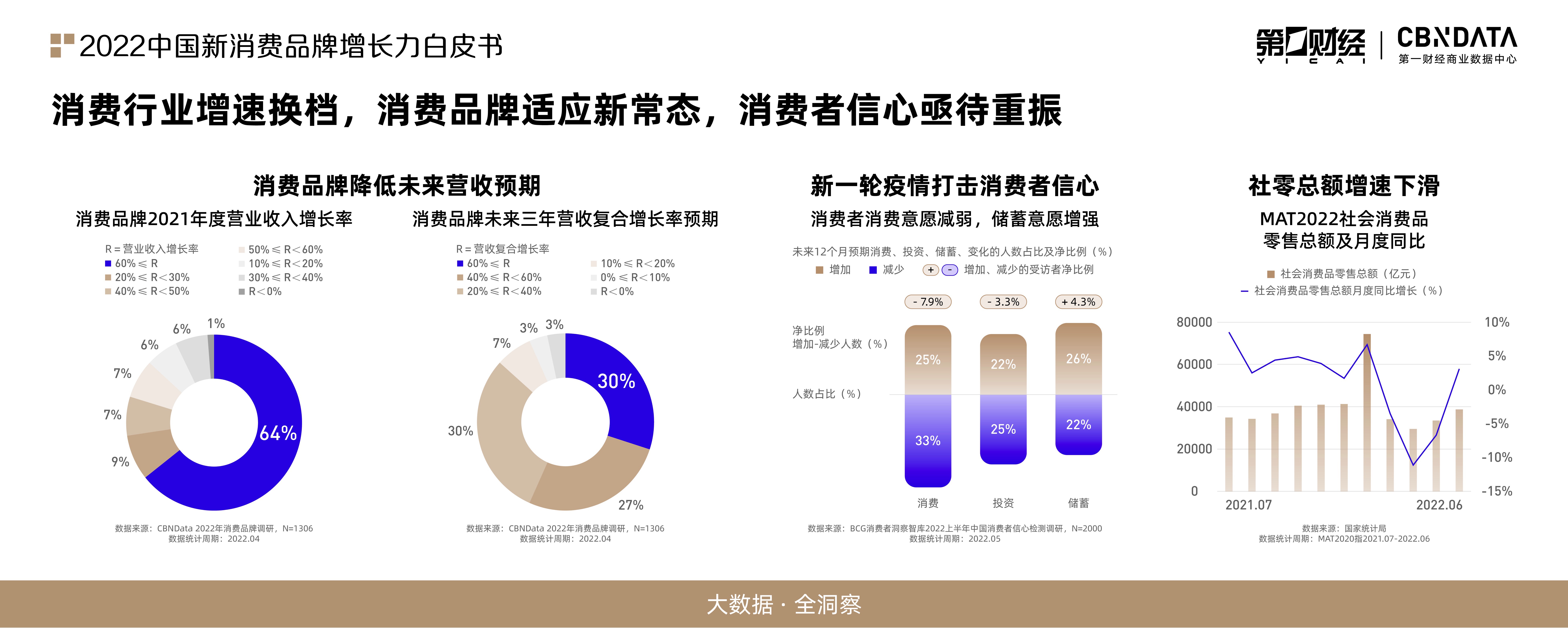 8月24日,第一财经、CBNData(第一财经商业数据中心)共同重磅发布《2022中国新消费品牌增长力白皮书》(以下简称为白皮书)。白皮书制作共历时5个月、携手27家数据研究机构、集合5031位受访者、汇聚100+专家意见,最终沉淀出23万字的研究成果。
