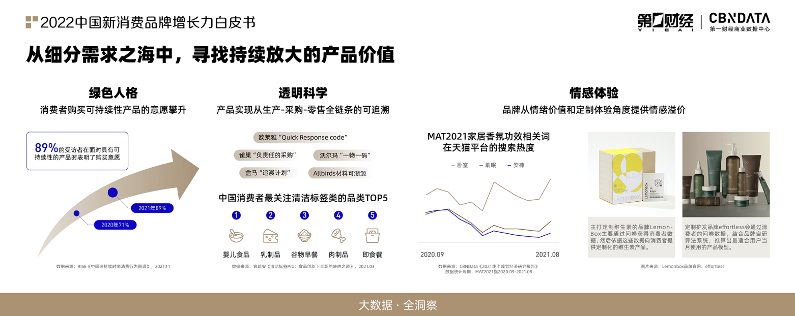 过去一年,我们留意到消费者需求有三个方面在不断提高和扩大:首先是“绿色人格”。当前有89%的受访者愿意购买可持续产品,消费者的环保意识开始落地到购买行动上。为了迎合消费者,不少大企业都推出了碳中和产品,比如碳中和酸奶、冰淇淋,一些跨国食品品牌的中国工厂甚至实现了全产线的碳中和。