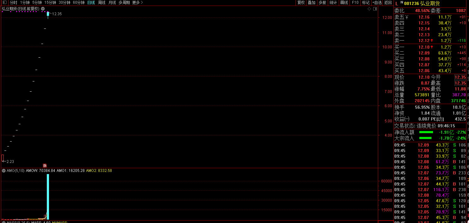 8月29日早盘,已经连续16个涨停板的新股弘业期货开盘后放量炸板。截至发稿,报12.10元,涨7.75%,成交金额已超过7亿元,换手率接近60%。