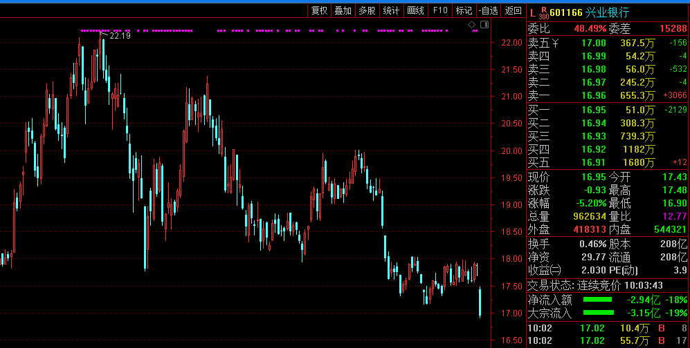 8月29日早盘,兴业银行开盘重挫。截至发稿报16.95元,跌5.20%。