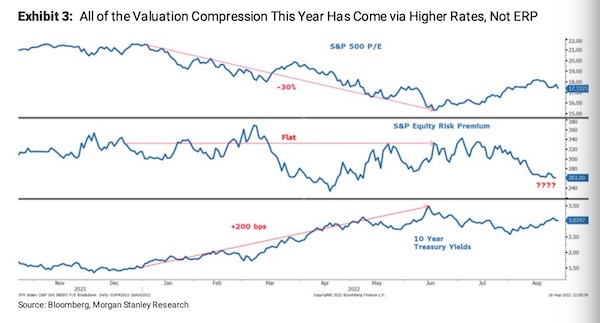 此外,威尔逊认为,目前就股票风险溢价(ERP,买入股票相对于债券的溢价)而言,美股性价比较低。他分析称,随着美股飙升、美债收益率攀升,ERP在过去几个月里暴跌,接近2008年金融危机时期以来的历史低点水平。事实上,过去14年里,ERP比这还要低的时期,是在今年3月初的熊市反弹结束时,而后发生的事众人皆知(纳指一度重挫近30%)。在上周五美股以暴跌收盘后,ERP也仅为280BP,根据摩根士丹利的模型,ERP应该在400BP附近。