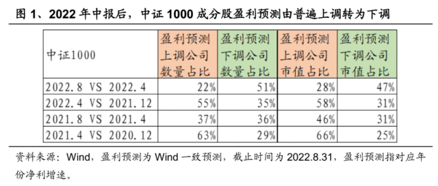 2022年中报披露后,中证1000今年盈利预测由4月底的普遍上调转为普遍下调,近期股价的回调可能在修正此前对基本面的预期。与2021年12月底相比,2022年4月底一季报披露完毕后,如图1所示,中证1000盈利预测上调公司数量占比和市值占比大幅增加,但是由于市场整体的下跌,导致股价与基本面出现阶段性的不匹配,中证1000自4月底反弹以来的强劲表现在一定程度上反映了估值对基本面的“追赶修复”。但是中报披露后,如图1所示,盈利预测上调公司数量占比和市值占比明显反转,由普遍上调转为普遍下调,可能出现了某种程度的“业绩证伪”,近期股价的走势可能也在反映基本面的弱化。
