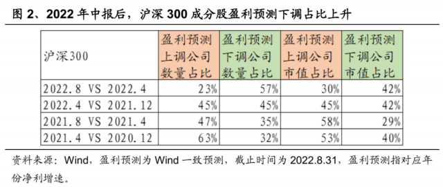 沪深300今年盈利增速在一季报后无明显变化,今年中报后则有所下调,反映宏观经济向上弹性有所承压。4月底的反弹以来,沪深300表现较弱,除了筹码结构原因之外,沪深300的基本面预期在2022年4月底与2021年12月底相比变化不大,估值相对基本面的修复“意愿”也就不够强烈。如图2所示,与去年12月底相比,2022年4月底沪深300成分股上调盈利预测公司数量与市值占比几乎相同,显示基本面整体向上的弹性较小。中报披露后,沪深300成分股盈利预测进一步下调,不过由于股价整体表现弱势,近期的股价回调幅度相对较小。