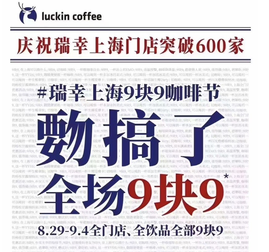 为促进市场活力,提振消费信心,多家咖啡品牌都推出了促销活动。本周,瑞幸咖啡宣布上海门店突破600家,同时推出“瑞幸上海9块9咖啡节”,从8月29日至9月4日,瑞幸咖啡上海全门店、全饮品,全部9.9元。