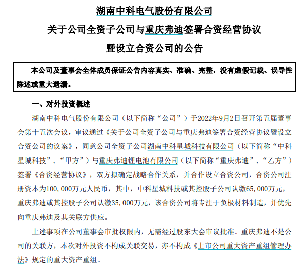 9月2日,中科电气公告,全资子公司中科星城科技与比亚迪全资子公司重庆弗迪签署《合资经营协议》,双方拟确定战略合作关系,并合作设立合资公司,合资公司注册资本为10亿元,其中,中科星城科技或其控股子公司认缴6.5亿元,重庆弗迪或其控股子公司认缴3.5亿元。