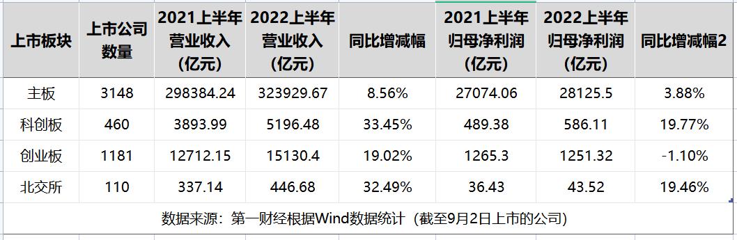 再看注册制板块,截至9月2日,今年上半年,科创板460家上市公司合计实现营收5196.48亿元,同比增长33.45%;归母净利润586.11亿元,同比增长19.77%。同期,创业板1181家公司披露今年上半年业绩信息,合计实现营收1.51万亿元,同比增长19.02%;归母净利润为1251.32亿元,同比下降1.10%。