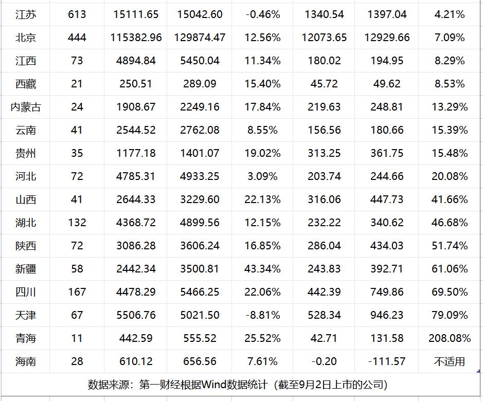 当然,也有部分地区上市公司在今年上半年业绩表现较好。根据第一财经统计,截至9月2日上市的公司中,有11个省市自治区的公司上半年归母净利润同比增10%以上,其中青海省的公司归母净利润增幅达到208.08%,天津、四川、新疆、陕西的公司归母净利润增幅超过50%,湖北、陕西的公司归母净利润增幅则在40%以上。