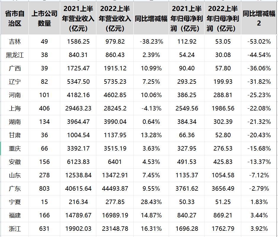 值得注意的是,疫情成为部分地区上市公司业绩的一大“拦路虎”。第一财经统计发现,吉林、天津、上海、江苏4个省市的营业收入同比下滑;除海南省公司业绩亏损扩大外,吉林、上海等12个省市的上市公司归母净利润同比下滑,10个省市的降幅在10%以上。当然,也有11个省市自治区的公司上半年归母净利润同比增10%以上。
