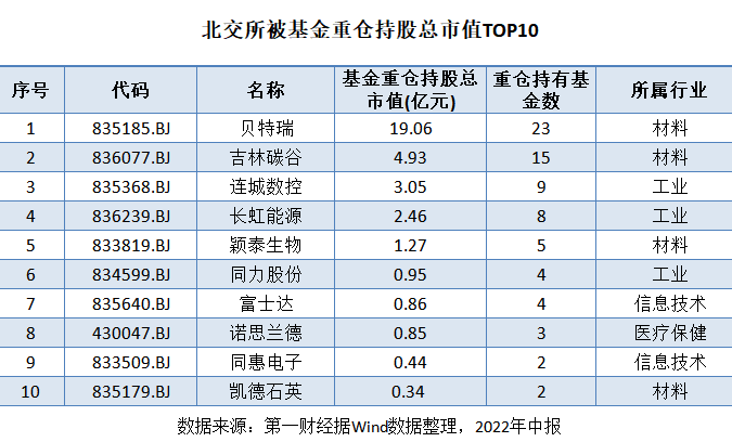 2022年中报数据显示,有565只基金持有61只北交所上市公司,持股总市值达68.64亿元。若以公募基金的前十大重仓股为标准,则有27家北交所个股被基金重仓,合计持股市值为36.28亿元;其中,前五大市值股分别为贝特瑞(19.06亿元)、吉林碳谷(4.93亿元)、连城数控(3.05亿元)、长虹能源(2.46亿元)和颖泰生物(1.27亿元)。