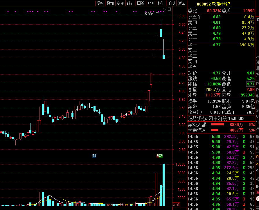 盘面上,欢瑞世纪今日放量跌停,为连续2个交易日跌停;在此之前,欢瑞世纪连续5个交易日涨停。
