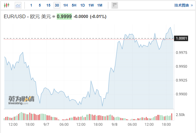 受俄罗斯上周五宣布无限期“断气”影响,欧元兑美元在此前跌破平价后,本周进一步跌穿0.99关口,一度跌至0.9864美元的2002年10月以来最低点。周三盘尾上涨0.8%,报0.9985美元。今日欧央行议息前,受到欧央行“鹰派”加息预期提振,欧元对美元重返平价上方,且在欧洲央行利率决议公布前十分钟内迅速走高至1.0024,但在决议公布后二十分钟内重新跌破平价,随后在平价上下波动。