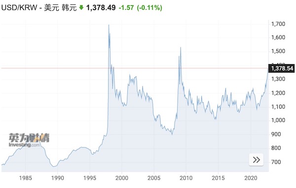 另一边,韩元贬值从2021年1月开始已持续20个月,目前韩元对美元汇率失守1380关口,年初至令累计贬值13%,成为仅次于日元的最弱亚洲货币。