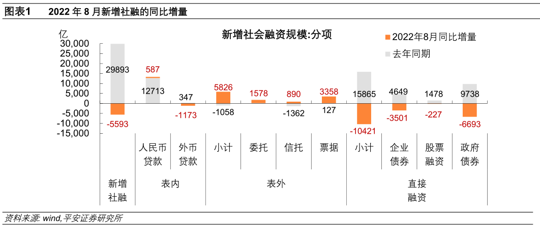 8月社融同比少增。2022年8月新增社会融资规模2.43万亿,较去年同期低5571亿元,但高于市场一致预期的2万亿左右。社融存量同比增速较上月下滑0.2个百分点至10.5%。剔除政府债部分后的社融存量增速为9.06%,持平于7月。从分项数据看,人民币信贷同比稳中有升,新增社融的拖累因素在于直接融资和外币贷款,而表外融资对社融构成支撑。