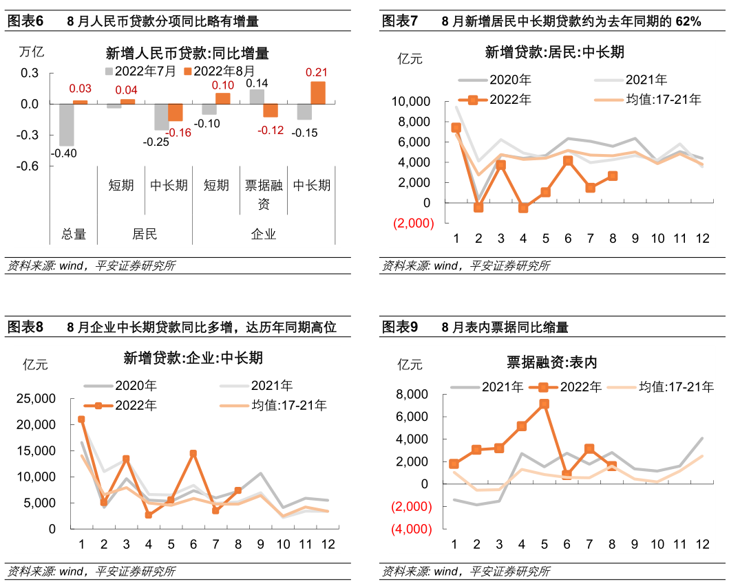 8月新增人民币贷款同比略有多增,较7月边际回暖。8月新增人民币贷款1.25万亿,同比多增300亿元,相比17-21年同期均值多增340亿元;贷款存量同比增长10.9%,相比上月下滑了0.1个百分点。人民币信贷的支撑因素在于企业的短期、中长期贷款同比均多增,居民短期贷款在低基数下企稳;拖累因素则是居民中长期贷款和票据融资同比缩量。具体地: