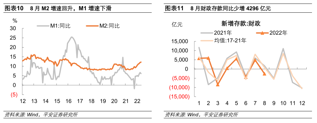 8月M2增速继续上行,M1增速下滑。人民币信贷企稳、财政资金持续投放,助力M2增速进一步上行。而M1同比增速下滑,或因房地产销售低迷、经济弱修复下,企业短期经营性现金流入不强,对未来预期偏弱也可能使部分企业存款由活期转为定期。从存款结构看:一方面,居民、企业存款继续同比多增:居民消费意愿不足、房地产销售偏弱;企业信贷边际回暖,且财政支出加快、减税降费政策有所支持。另一方面,财政存款同比大幅少增,除财政支出加码发力的影响外,收入端政府债净融资放缓、土地收入下滑、减税降费政策推进可能也有一定拖累。