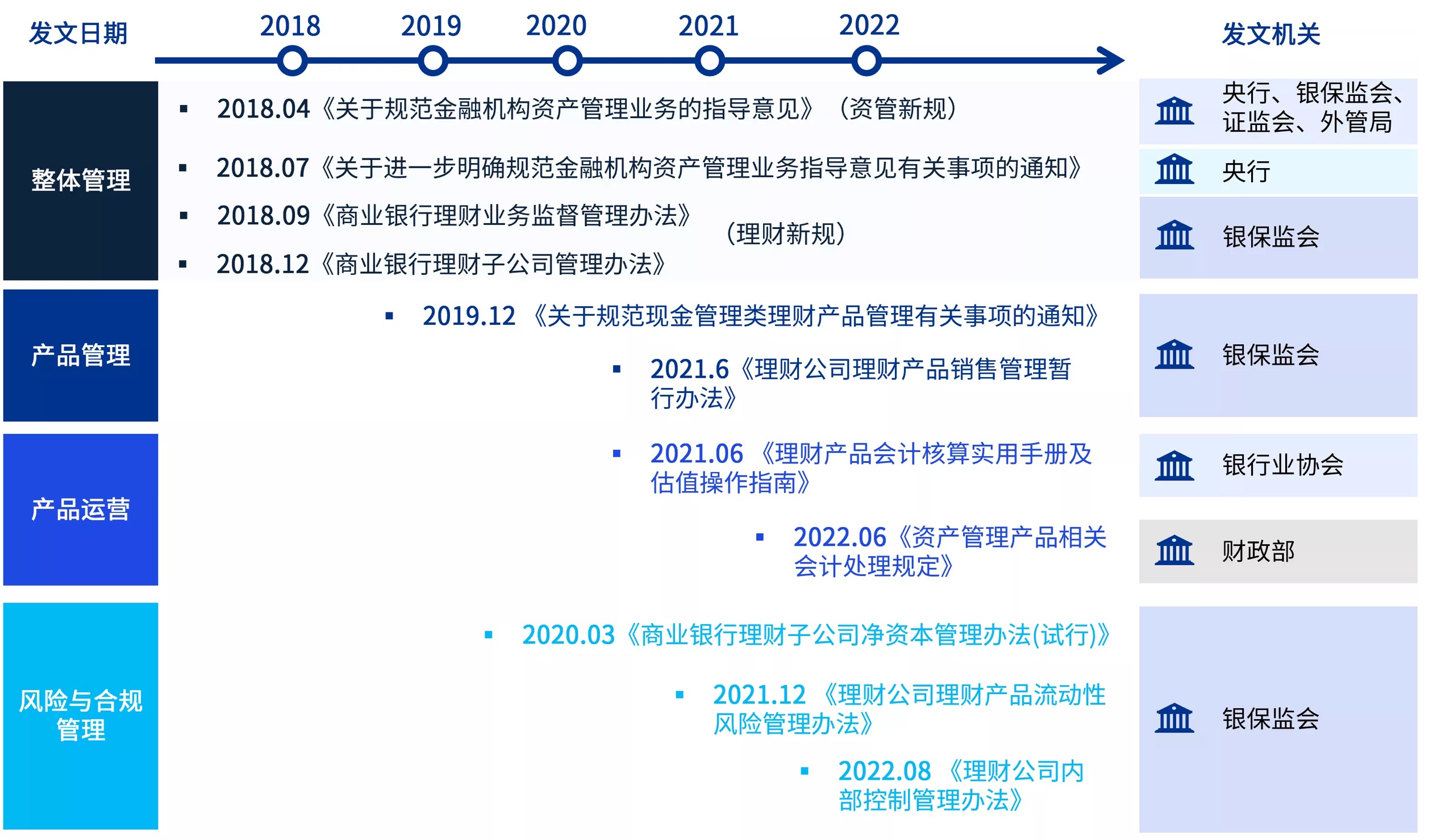 2018年以来,围绕资管新规和理财新规的监管细则陆续出台,在理财业务产品管理、产品运营、内控合规、风险管理等方面的监管要求逐步完善。2022年8月,银保监会发布了《理财公司内部控制管理办法》(以下简称“内控办法”),进一步补充了理财公司内部控制和风险管理的监管制度框架,也对理财业务后续合规化发展提出了更高的要求。
