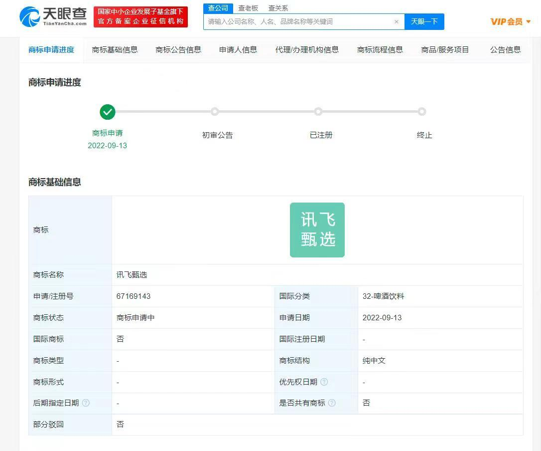 天眼查App显示,近日,科大讯飞股份有限公司申请注册多个“讯飞甄选”商标,国际分类为啤酒饮料、社会服务、科学仪器等,目前商标状态均为申请中。