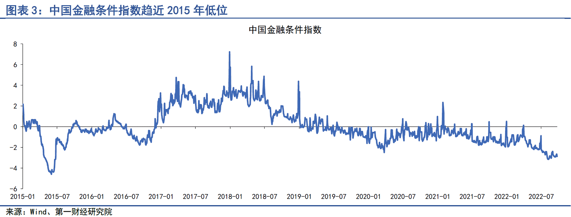 从历史数据来看,中国金融条件指数自今年4月起存在快速下降的趋势,已趋近2015年的低位。