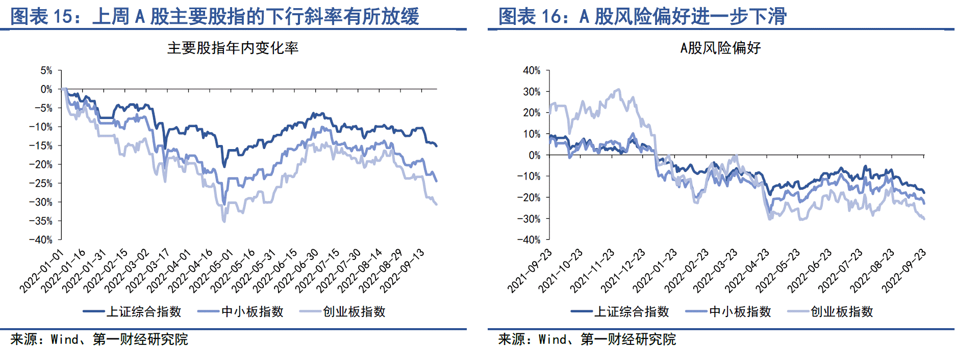 在9月19日至9月23日的当周,A股主要股指均走弱,但走弱幅度较前一周有所好转。上证综指周内累计跌幅达1.2%,中小板指数周内累计跌幅达2.2%,创业板指周内累计跌幅达2.7%。