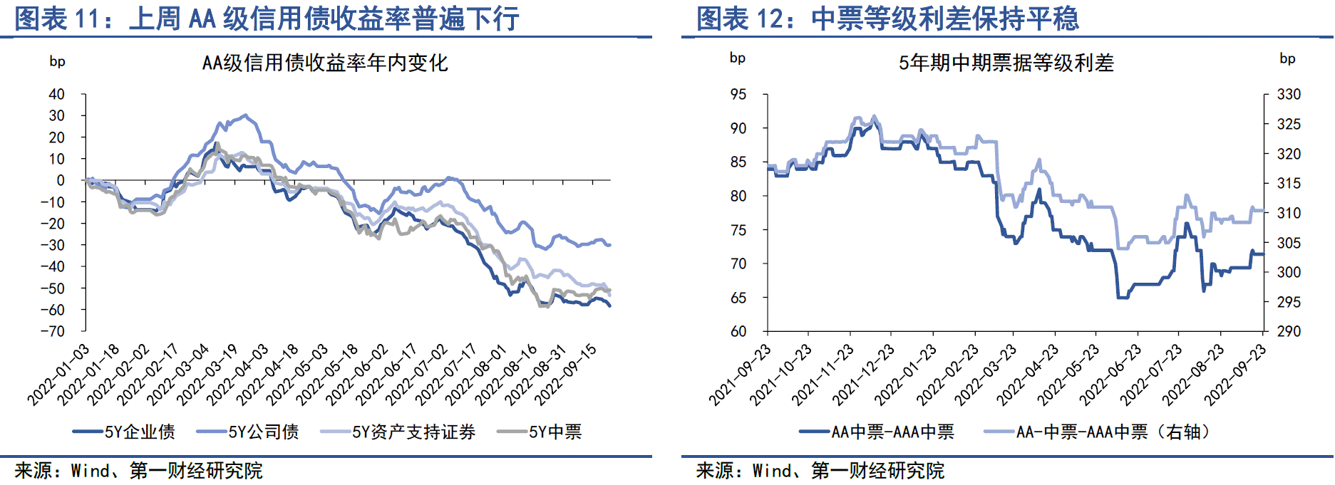 上周信用债等级利差基本保持平稳。从中票等级利差来看,截至9月23日,AA级中票与AAA级中票之间的利差为71.36bp,AA-级中票与AAA级中票之间的利差为310.36bp,均与前一周基本一致。