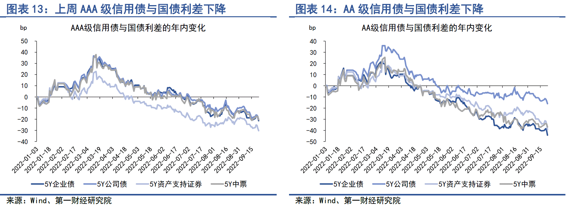 上周,信用债收益率普遍下行。具体来看,在AAA级债券中,5年期企业债、公司债、资产支持证券以及中票收益率在周内分别下降0.59bp、1.74bp、1.94bp和0.18bp。在AA级债券中,5年期企业债、公司债、资产支持证券以及中票收益率在周内分别下降3.59bp、2.18bp、4.87bp和0.18bp。