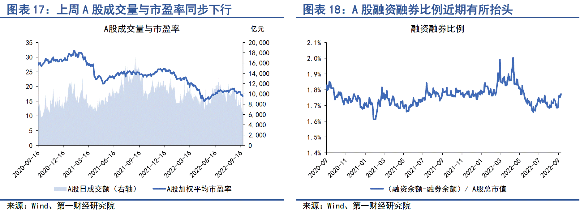上周,A股整体成交量继续下行,日均成交量降至6553.40亿元,较前一周的8057.43亿元下降幅度达到18.67%。此外,A股整体估值也持续下行。截至9月23日,经各板总市值加权调整的市盈率约为16.72,较前一周的17.18下降2.68%。