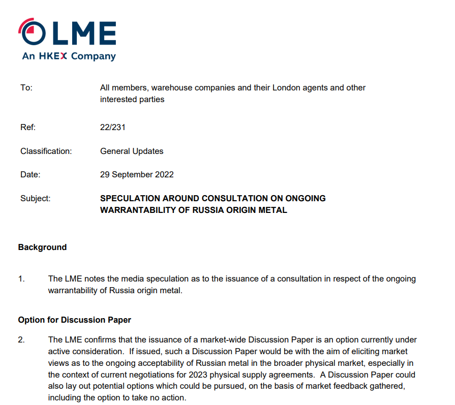 LME强调,目前正在征求意见,且就算文件经讨论后确认发布,也不代表禁令实际生效。