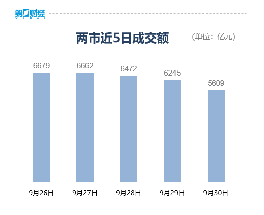 9月30日,三大指数高开低走全天大幅震荡,创业板指表现较弱,跌近2%。截至收盘,沪指跌0.55%,深证成指跌1.29%,创业板指跌1.89%。总体上个股跌多涨少,两市超3400只个股下跌。沪深两市今日成交额5609亿,较上个交易日缩量636亿。