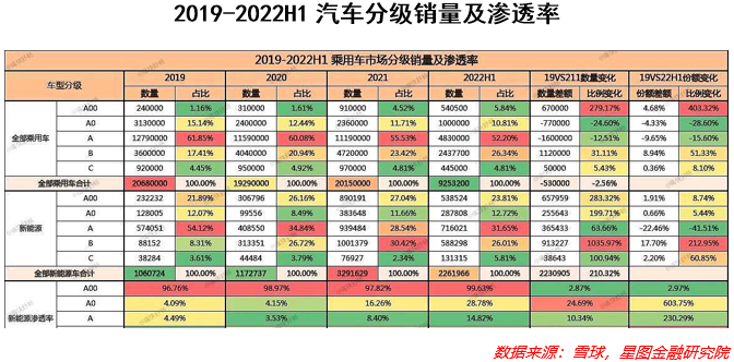 首先来看产品结构性的因素。以汽车中A00、A0、A、B、几类分级汽车的销量和渗透率来看。在2019年,A00级别的车销量约为23万辆,在新能源车市场中的占比约为22%。