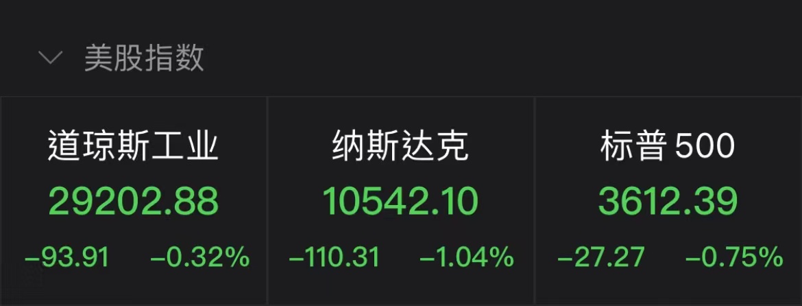 周一,美股三大指数集体收跌。投资者关注本周将公布的财报及通胀报告。截至收盘,标普500指数跌0.75%,报3612.39点;纳指跌1.04%,报10542.10点,创近两年新低;道指跌0.32%,报29202.88点。