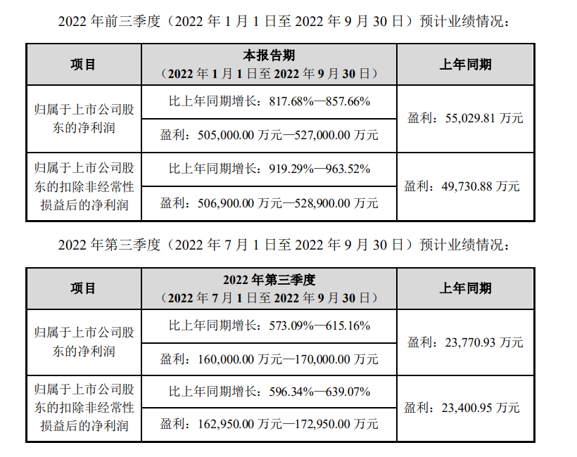 10月11日,天华超净发布2022年前三季度业绩预告,公告称,预计前三季度净利润50.5亿元-52.7亿元,同比增长817.68%-857.66%。第三季度净利润预计同比增长573.09%-615.16%。