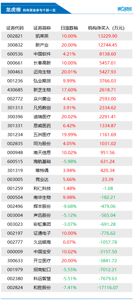 当天机构净买入前三的股票分别是凯莱英、新产业、中国软件,净买入金额分别是1.32亿元、1.28亿元、8139万元。
