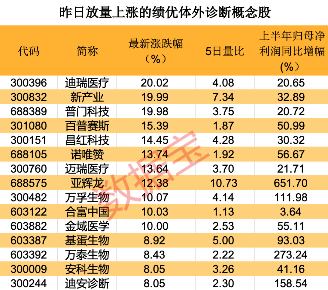 目前来看,整体医药板块估值处于历史性低点,多家机构认为医药行业或将迎来拐点和大面积反弹,估值有望迎来重塑,体外诊断是机构看好的方向之一。据统计,A股中体外诊断概念股有近60只,9股年内累计涨幅录得正值,其中合富中国、明德生物、新开源涨幅居前,年内均涨超30%。(数据宝)