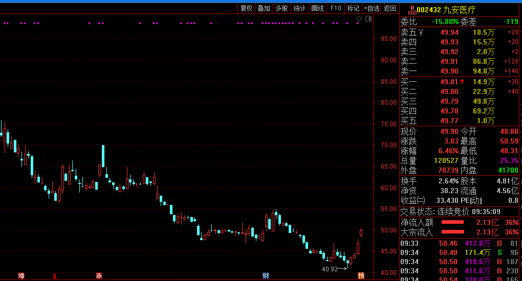 10月17日早盘,九安医疗高开高走。截至发稿报49.81元,涨6.46%。