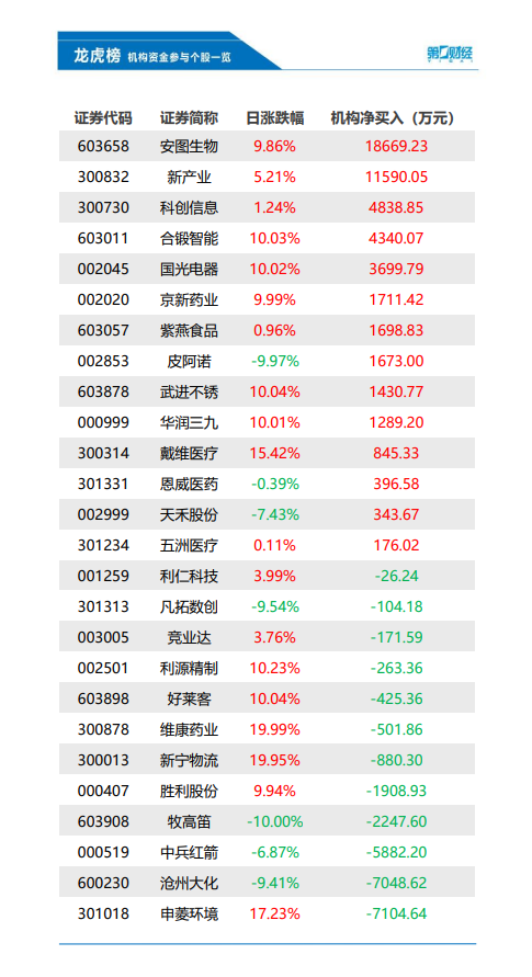 当天机构净买入前三的股票分别是安图生物、新产业、科创信息,净买入金额分别是1.87亿元、1.16亿元、4839万元。