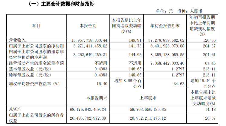 10月18日,广汇能源披露三季报,第三季度实现营业收入159.58亿元,同比增长149.91%;净利润32.71亿元,同比增长141.73%;基本每股收益0.50元。
