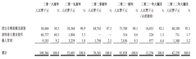 目前,授出音乐版权及录制是公司营收的大头,在2019年至2022年上半年间,该业务为公司贡献的营收占比一直在90%以上,且营收在逐年上升。根据灼识咨询报告,按授出音乐版权及录制产生的收益计算,公司2021年在中国400多家音乐唱片公司中排名第15位,占有约0.6%的市场份额。