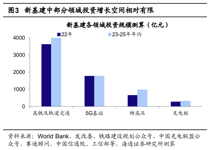 从各大领域未来投资规模的空间看,根据我们整理和测算,22年新基建在高铁及轨道交通领域投资3614亿(预计23-25年投资规模均值约3982亿,下同),5G基站超1700亿(1763亿),特高压为640亿(967亿),充电桩为250亿(309亿)。